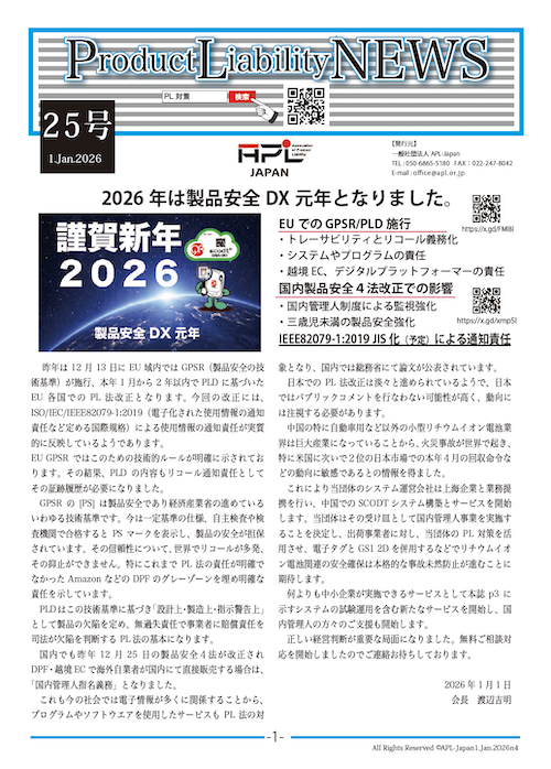 2026年1月3日 / 最終更新日時 : 2026年1月3日 pltaisaku お知らせ 2026.1.1 PLnews25号PLnews25号を発行しました。右の画像からPDFをダウンロードできます。今月の内容巻頭文「2026年は製品安全DX元年となりました」今回の法改正のポイント未来の安全安心サービス「ミニ・コンサル・パッケージ(MCP)」で始めましょう。事務局だよりPLnews25号(画像クリックで開きます)FacebookXBlueskyCopy