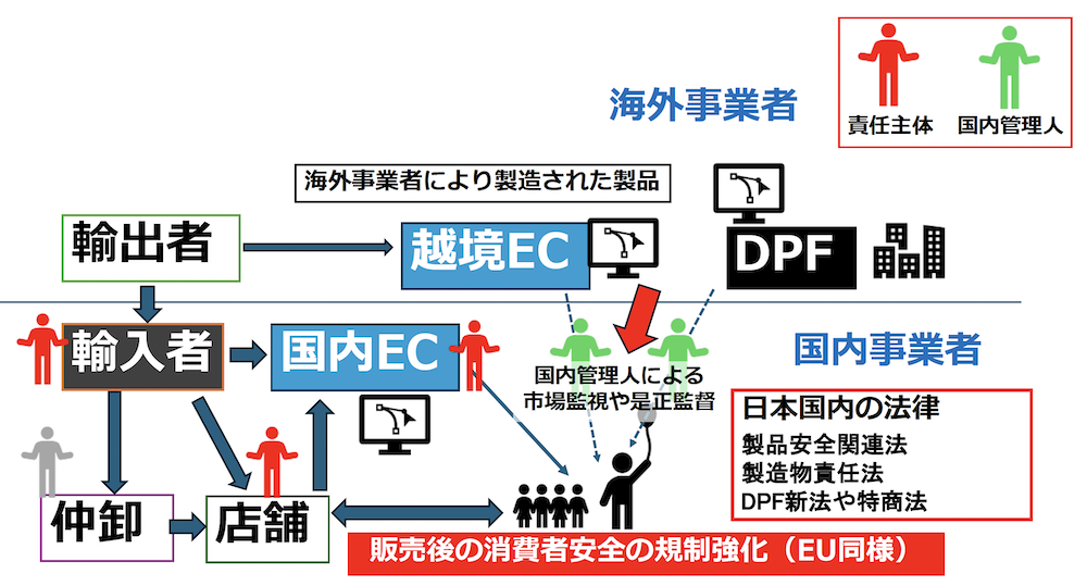 国内管理人はPL法などの責任はありませんが、輸入販売事業者や国内の製造販売事業者は責任主体として国内管理人同様の責任が明確になりました。