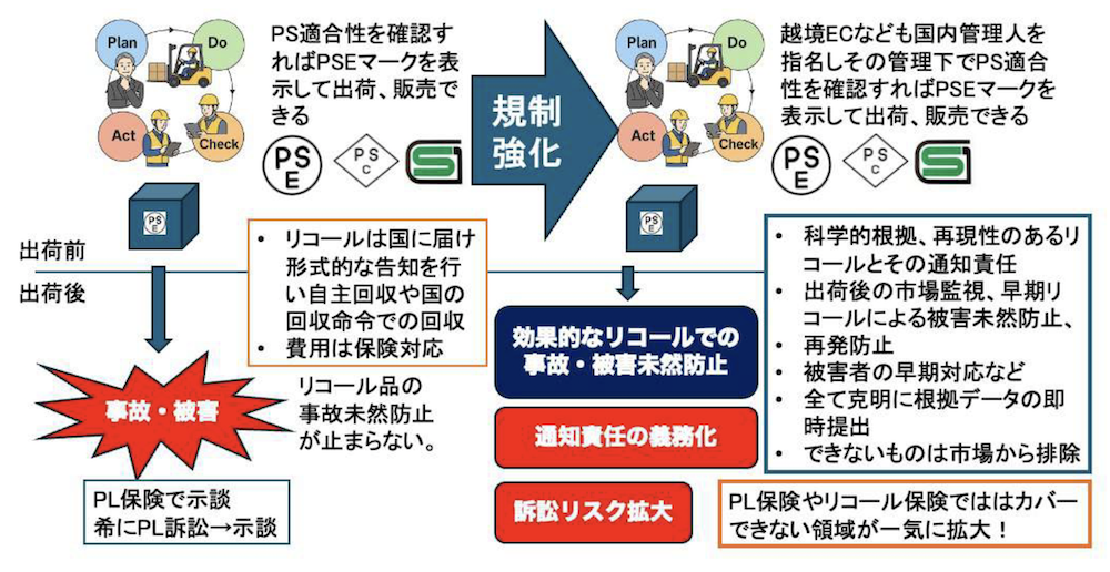従来のPS申請、マーク表示と新たに出荷後の消費者安全確保の義務強化が開始されています。
